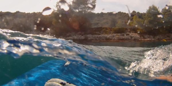 Three years ago R&D, aimed to solve this problem, was started. First prototype resembled a polycarbonate pyramide look like deflector that protected user from the wave build up. Left fIgure shows view through the deflector right side, during surface ride. Some other authors proposed deflectors optimised for underwater performance as one described in US5007871 After several prototypes REZRON concept was developed and patent is filed. Protected form is optimised for underwater and on water performance
